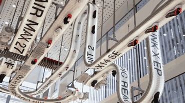 ▼運(yùn)動(dòng)風(fēng)滿(mǎn)滿(mǎn)的耐克上海001店,建筑內(nèi)部布置了測(cè)試身體機(jī)能的小賽道,工業(yè)感十足選購(gòu)衣服的滑軌等等的交互模式,都讓顧客從體驗(yàn)和選購(gòu)都心動(dòng)無(wú)比。