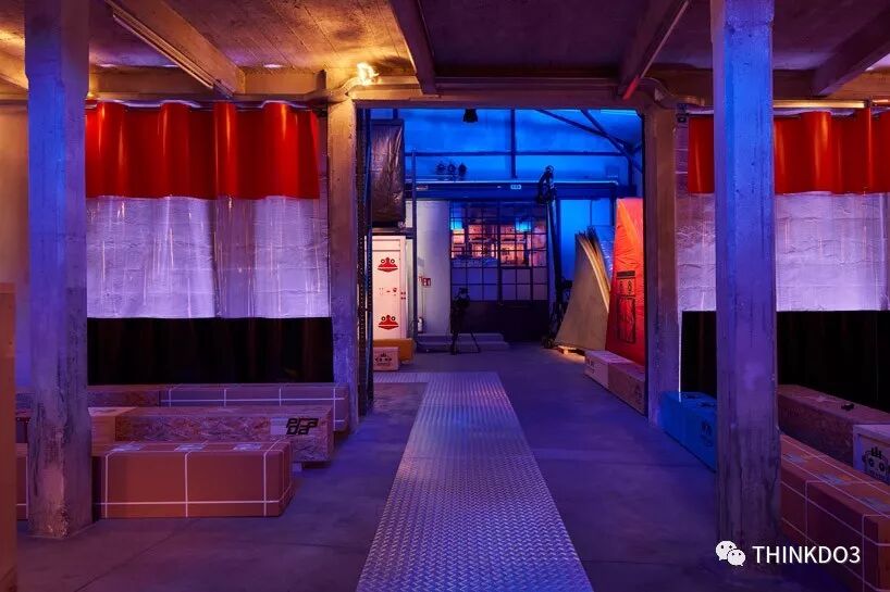 倉庫位于米蘭市郊東南部,整體設(shè)計與品牌的工業(yè)化特征相一致。穿過塑料簾布進入秀場,這個多彩的空間轉(zhuǎn)化為一座夢幻的超現(xiàn)實主義檔案館,秀場被分為多個區(qū)域,每個區(qū)域都分別對應(yīng)一個的特定主題。