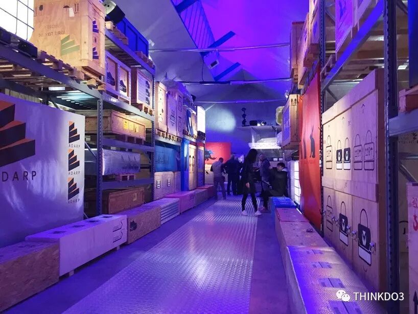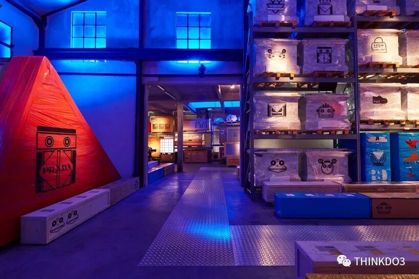 在一個堆滿了擺放著膠合板和箔紙箱子的貨架堆場中,大都會建筑事務(wù)所(OMA)研究與設(shè)計工作室AMO為普拉達(prada)2018秋冬男裝春夏展完成了場地裝置,這一裝置稱之為“prada warehouse(普拉達倉庫)。