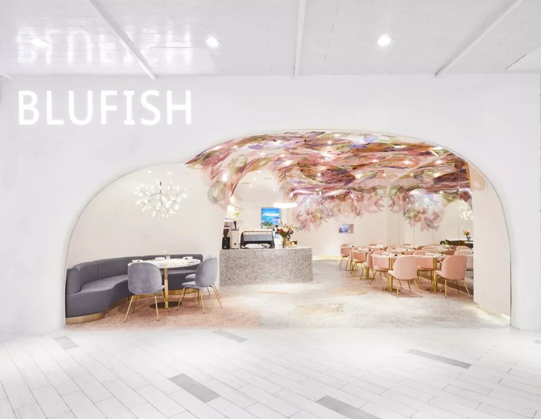 BLUFISH-APM餐廳位于王府井APM商場的地下一層,以清透的白為基底,藍與粉等色彩交織的金屬網(wǎng)從頂部天花向下延伸,營造整體充滿夢幻與流動感的水下世界。