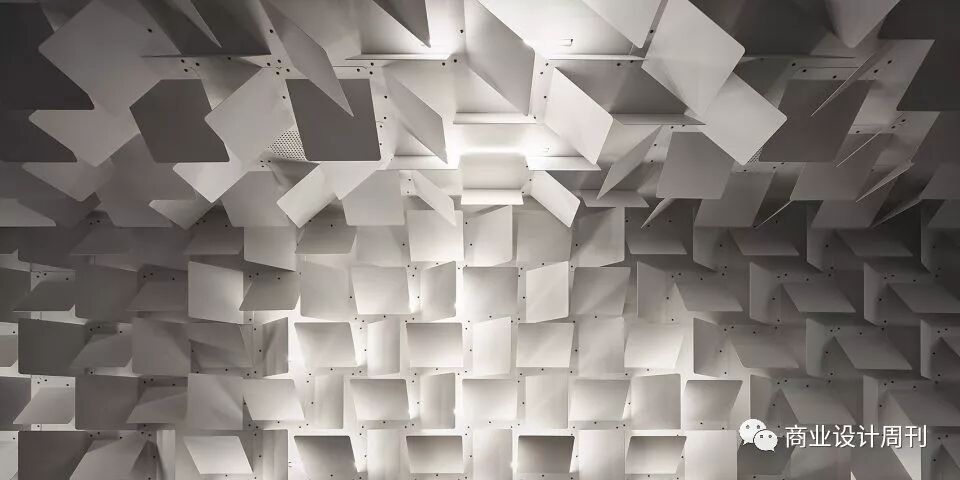 設(shè)計師還將貨架內(nèi)光源也設(shè)計成了和木板外形一致的幾何形狀,并將兩者穿插在一起,這樣一來,每一間小格子里都可以被黃色的燈光照亮。