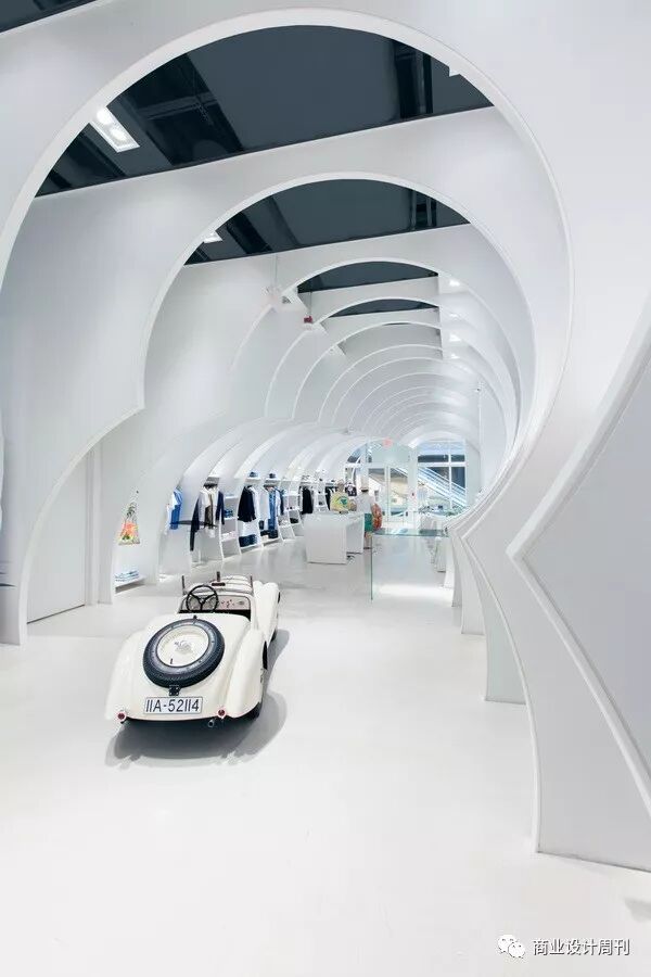 為此,雙筒望遠鏡是商店的標志,由兩個交錯的圓圈組成,是空間內(nèi)部設(shè)計的起點。通過這個“雙筒望遠鏡”,進入室內(nèi),有24個平行的白色面板被放置在整個商店的長度,以創(chuàng)造一個隧道。