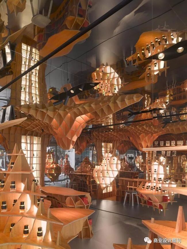 店內(nèi)呈現(xiàn)由不規(guī)則形狀木材穿插而成的貨架、展示桌,或是獨立于空間中,或是被鑲嵌在鏡面墻壁、天花板上,遠看仿如漂浮在空中一般。