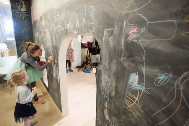 得益于空間的多功能性,隨時可以進行改造,在這里可以安排各種活動,如果孩子們愛涂愛畫,就把墻變成黑板吧!