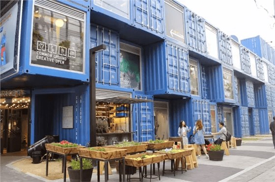 這家名為Common Ground四層的混合式購(gòu)物中心,位于建國(guó)大學(xué)附近,總共由 200個(gè)藍(lán)色貨柜所堆砌而成。中間的廣場(chǎng)將整個(gè)空間分成了 Street Market 和 Market Hall,左右兩邊分別售賣男女裝的區(qū)域。兩個(gè)區(qū)域均有三個(gè)樓層,底下的1、2層都以服飾為主,而第3層則是觀光臺(tái)以及餐廳等。